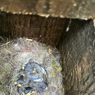 Back in March, our group members made nestboxes for Blue and Great tits. We then hung these up on the trees around the site. One of the highlights of our project has been following the progress of these boxes – witnessing the gradual building of the nests inside the boxes, the laying of eggs, the hatching of the chicks, the growing and feeding of the young families and then the fledging of the young birds. It is lovely to think that some of the singers in the trees might have been born and raised in our nestboxes!